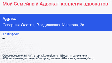 Мой Семейный Адвокат, коллегия адвокатов по адресу Северная Осетия, Владикавказ, Маркова, 2а в дальнейшем Организация, размещена в следующих категориях:
