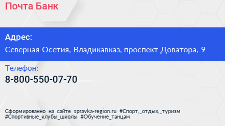 Почта Банк по адресу Северная Осетия, Владикавказ, проспект Доватора, 9 в дальнейшем Организация, размещена в следующих категориях: