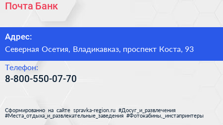 Почта Банк по адресу Северная Осетия, Владикавказ, проспект Коста, 93 в дальнейшем Организация, размещена в следующих категориях: