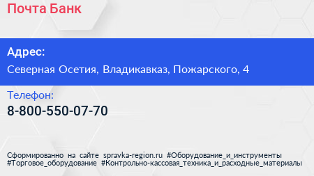 Почта Банк по адресу Северная Осетия, Владикавказ, Пожарского, 4 в дальнейшем Организация, размещена в следующих категориях: