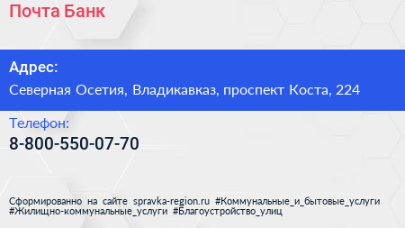 Почта Банк по адресу Северная Осетия, Владикавказ, проспект Коста, 224 в дальнейшем Организация, размещена в следующих категориях: