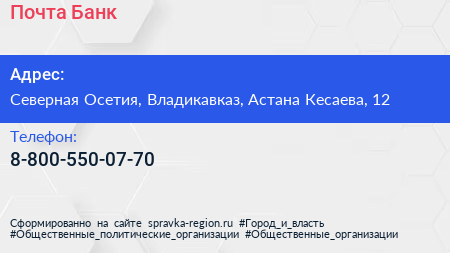 Почта Банк по адресу Северная Осетия, Владикавказ, Астана Кесаева, 12 в дальнейшем Организация, размещена в следующих категориях: