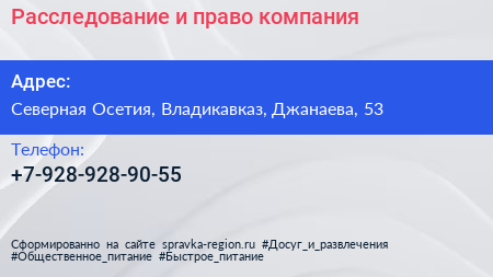 Расследование и право, компания по адресу Северная Осетия, Владикавказ, Джанаева, 53 в дальнейшем Организация, размещена в следующих категориях: