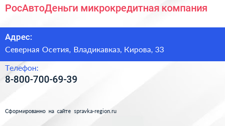 РосАвтоДеньги, микрокредитная компания по адресу Северная Осетия, Владикавказ, Кирова, 33 в дальнейшем Организация, размещена в следующих категориях: