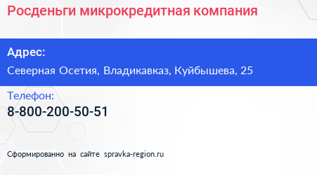 Росденьги, микрокредитная компания по адресу Северная Осетия, Владикавказ, Куйбышева, 25 в дальнейшем Организация, размещена в следующих категориях: