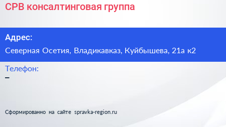 СРВ, консалтинговая группа по адресу Северная Осетия, Владикавказ, Куйбышева, 21а к2 в дальнейшем Организация, размещена в следующих категориях: