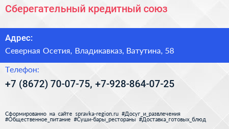 Сберегательный кредитный союз по адресу Северная Осетия, Владикавказ, Ватутина, 58 в дальнейшем Организация, размещена в следующих категориях: