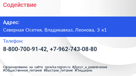 Содействие по адресу Северная Осетия, Владикавказ, Леонова, 3 к1 в дальнейшем Организация, размещена в следующих категориях: