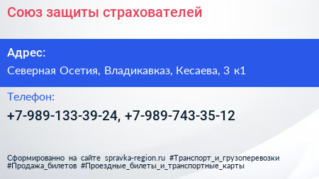 Союз защиты страхователей по адресу Северная Осетия, Владикавказ, Кесаева, 3 к1 в дальнейшем Организация, размещена в следующих категориях: