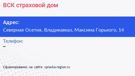 ВСК, страховой дом по адресу Северная Осетия, Владикавказ, Максима Горького, 14 в дальнейшем Организация, размещена в следующих категориях: