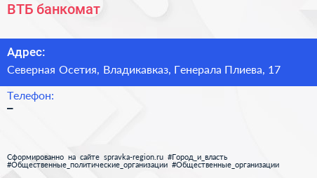 ВТБ, банкомат по адресу Северная Осетия, Владикавказ, Генерала Плиева, 17 в дальнейшем Организация, размещена в следующих категориях: