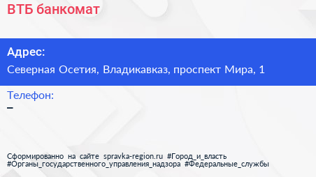 ВТБ, банкомат по адресу Северная Осетия, Владикавказ, проспект Мира, 1 в дальнейшем Организация, размещена в следующих категориях:
