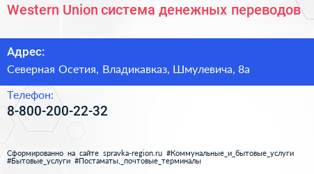 Western Union, система денежных переводов по адресу Северная Осетия, Владикавказ, Шмулевича, 8а в дальнейшем Организация, размещена в следующих категориях: