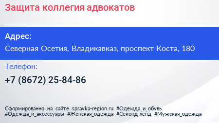 Защита, коллегия адвокатов по адресу Северная Осетия, Владикавказ, проспект Коста, 180 в дальнейшем Организация, размещена в следующих категориях: