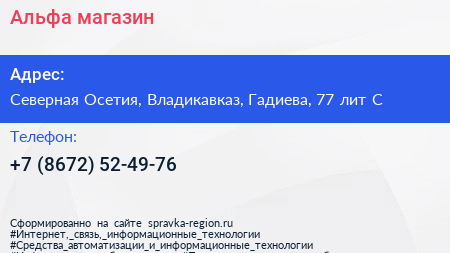 Альфа, магазин по адресу Северная Осетия, Владикавказ, Гадиева, 77 лит С в дальнейшем Организация, размещена в следующих категориях: