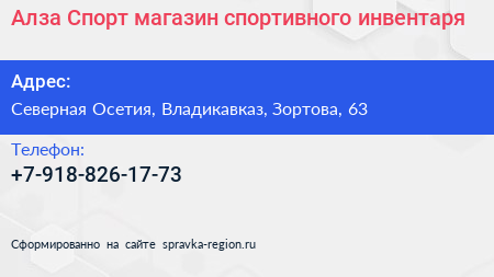 Алза Спорт, магазин спортивного инвентаря по адресу Северная Осетия, Владикавказ, Зортова, 63 в дальнейшем Организация, размещена в следующих категориях: