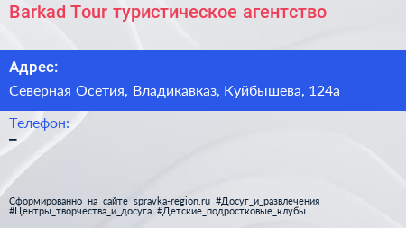 Barkad Tour, туристическое агентство по адресу Северная Осетия, Владикавказ, Куйбышева, 124а в дальнейшем Организация, размещена в следующих категориях: