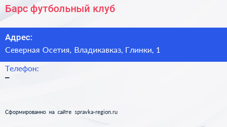 Барс, футбольный клуб по адресу Северная Осетия, Владикавказ, Глинки, 1 в дальнейшем Организация, размещена в следующих категориях: