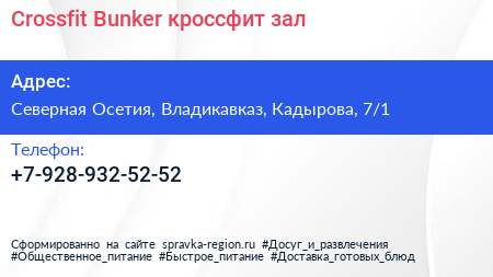 Crossfit Bunker, кроссфит-зал по адресу Северная Осетия, Владикавказ, Кадырова, 7/1 в дальнейшем Организация, размещена в следующих категориях: