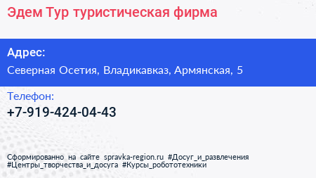 Эдем-Тур, туристическая фирма по адресу Северная Осетия, Владикавказ, Армянская, 5 в дальнейшем Организация, размещена в следующих категориях:
