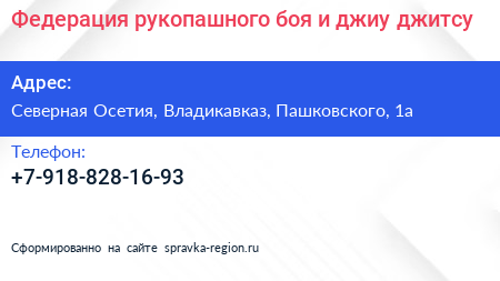 Федерация рукопашного боя и джиу-джитсу по адресу Северная Осетия, Владикавказ, Пашковского, 1а в дальнейшем Организация, размещена в следующих категориях: