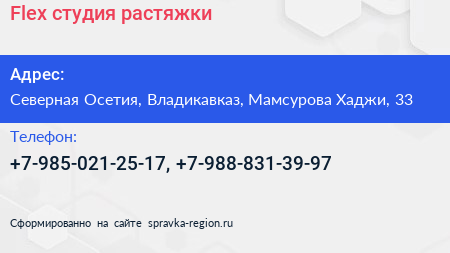 Flex, студия растяжки по адресу Северная Осетия, Владикавказ, Мамсурова Хаджи, 33 в дальнейшем Организация, размещена в следующих категориях: