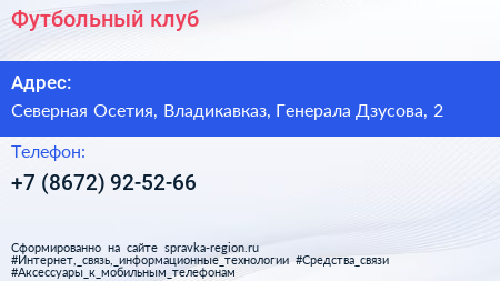 Футбольный клуб по адресу Северная Осетия, Владикавказ, Генерала Дзусова, 2 в дальнейшем Организация, размещена в следующих категориях: