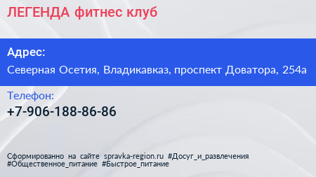 ЛЕГЕНДА, фитнес-клуб по адресу Северная Осетия, Владикавказ, проспект Доватора, 254а в дальнейшем Организация, размещена в следующих категориях: