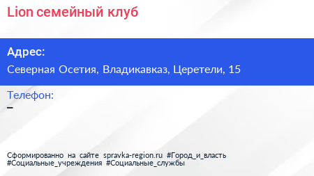 Lion, семейный клуб по адресу Северная Осетия, Владикавказ, Церетели, 15 в дальнейшем Организация, размещена в следующих категориях: