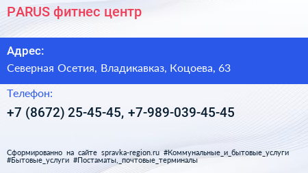 PARUS, фитнес-центр по адресу Северная Осетия, Владикавказ, Коцоева, 63 в дальнейшем Организация, размещена в следующих категориях: