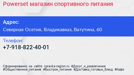 Powerset, магазин спортивного питания по адресу Северная Осетия, Владикавказ, Ватутина, 60 в дальнейшем Организация, размещена в следующих категориях: