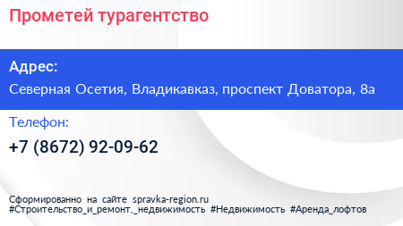 Прометей, турагентство по адресу Северная Осетия, Владикавказ, проспект Доватора, 8а в дальнейшем Организация, размещена в следующих категориях: