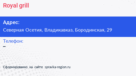 Royal grill по адресу Северная Осетия, Владикавказ, Бородинская, 29 в дальнейшем Организация, размещена в следующих категориях: