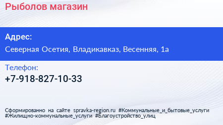 Рыболов, магазин по адресу Северная Осетия, Владикавказ, Весенняя, 1а в дальнейшем Организация, размещена в следующих категориях: