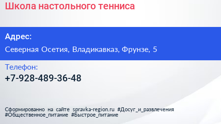 Школа настольного тенниса по адресу Северная Осетия, Владикавказ, Фрунзе, 5 в дальнейшем Организация, размещена в следующих категориях: