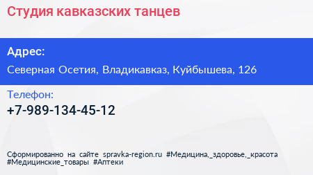 Студия кавказских танцев по адресу Северная Осетия, Владикавказ, Куйбышева, 126 в дальнейшем Организация, размещена в следующих категориях:
