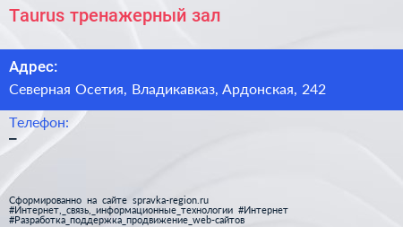 Taurus, тренажерный зал по адресу Северная Осетия, Владикавказ, Ардонская, 242 в дальнейшем Организация, размещена в следующих категориях: