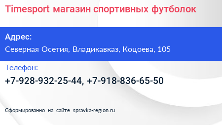 Timesport, магазин спортивных футболок по адресу Северная Осетия, Владикавказ, Коцоева, 105 в дальнейшем Организация, размещена в следующих категориях: