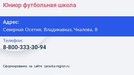 Юниор, футбольная школа по адресу Северная Осетия, Владикавказ, Чкалова, 8 в дальнейшем Организация, размещена в следующих категориях: