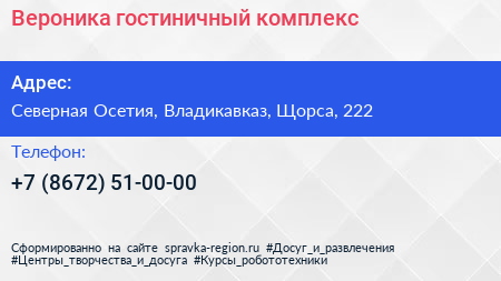 Вероника, гостиничный комплекс по адресу Северная Осетия, Владикавказ, Щорса, 222 в дальнейшем Организация, размещена в следующих категориях: