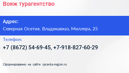 Вояж, турагентство по адресу Северная Осетия, Владикавказ, Миллера, 25 в дальнейшем Организация, размещена в следующих категориях: