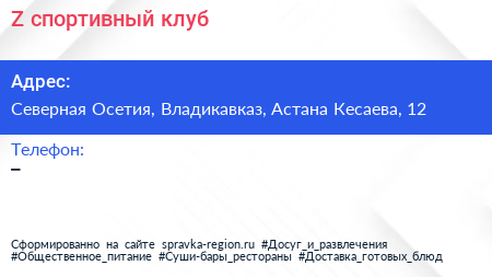 Z, спортивный клуб по адресу Северная Осетия, Владикавказ, Астана Кесаева, 12 в дальнейшем Организация, размещена в следующих категориях:
