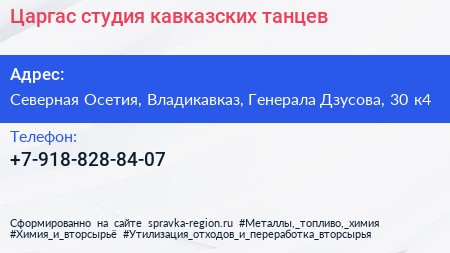 Царгас, студия кавказских танцев по адресу Северная Осетия, Владикавказ, Генерала Дзусова, 30 к4 в дальнейшем Организация, размещена в следующих категориях: