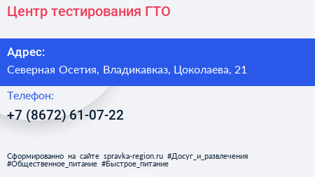 Центр тестирования ГТО по адресу Северная Осетия, Владикавказ, Цоколаева, 21 в дальнейшем Организация, размещена в следующих категориях: