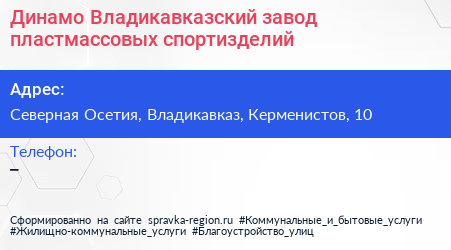 Динамо, Владикавказский завод пластмассовых спортизделий по адресу Северная Осетия, Владикавказ, Керменистов, 10 в дальнейшем Организация, размещена в следующих категориях: