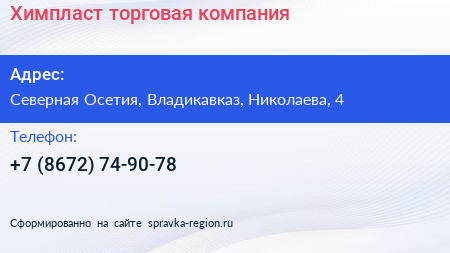 Химпласт, торговая компания по адресу Северная Осетия, Владикавказ, Николаева, 4 в дальнейшем Организация, размещена в следующих категориях: