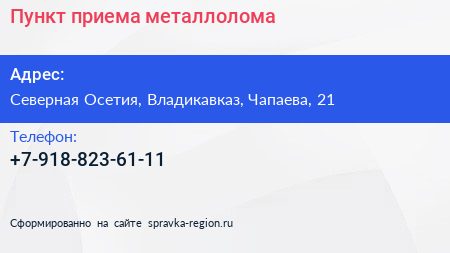 Пункт приема металлолома по адресу Северная Осетия, Владикавказ, Чапаева, 21 в дальнейшем Организация, размещена в следующих категориях: