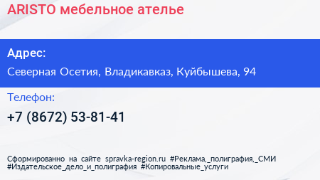 ARISTO, мебельное ателье по адресу Северная Осетия, Владикавказ, Куйбышева, 94 в дальнейшем Организация, размещена в следующих категориях: