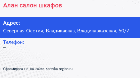 Алан, салон шкафов по адресу Северная Осетия, Владикавказ, Владикавказская, 50/7 в дальнейшем Организация, размещена в следующих категориях: