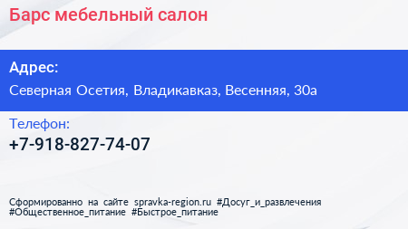 Барс, мебельный салон по адресу Северная Осетия, Владикавказ, Весенняя, 30а в дальнейшем Организация, размещена в следующих категориях: